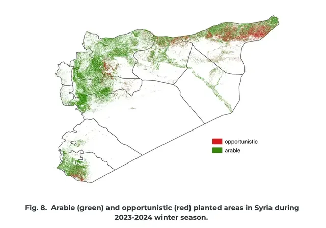 Agrograph was tasked with determining arable and opportunistic planting areas in the Middle East as defined by USDA-FAS. Arable regions are crop areas planted with wheat or barley in the last 3 seasons, while opportunistic regions are crop areas planted in the current (2023-2024) season but not in the previous seasons. These findings are expressed in the figure below.